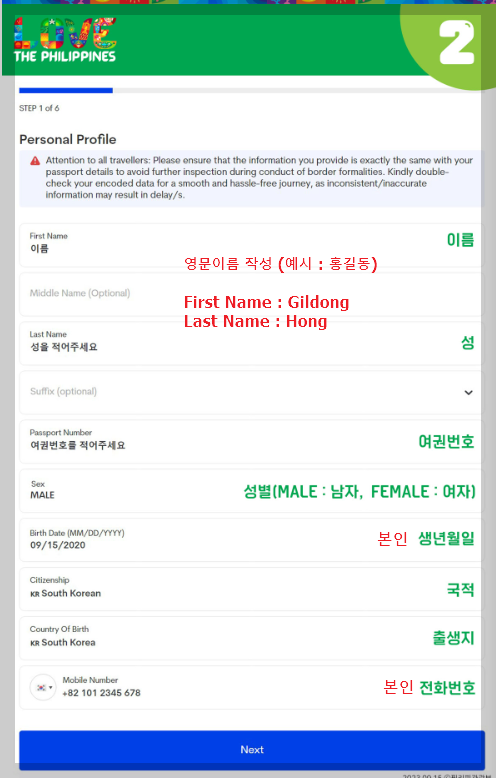 - 2 page : 영문이름 / 여권번호 / 성별 / 생년월일 등 정보 입력 (개인정보 이외 사항은 위 이미지 참조하여 작성)