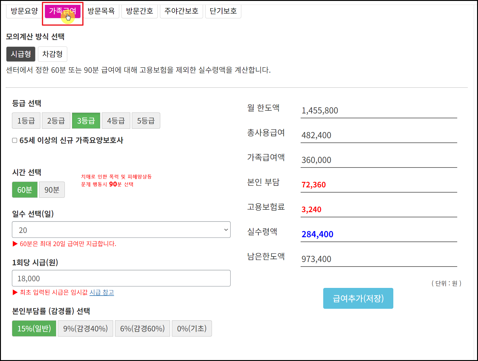 가족급여 모의계산을 통해 가족요양보호사 급여를 계산할 수 있습니다. 돌보는 사람의 등급 및 치매등의 형태에 따라 선택 후 급여를 계산하게 되며 해당 급여에서 공제되는 내역 또한 확인할 수 있습니다. 해당 급여에서 4대보험등 일정 비율을 공제 후 장기요양에서 급여를 지급하게되며 계산되는 금액보다 실수령액이 적음을 볼 수 있습니다.
