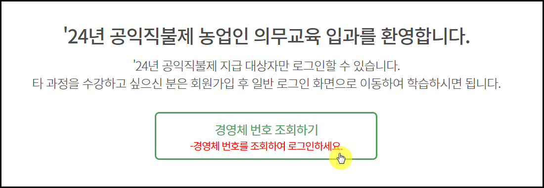 경영체번호 조회를 통해 본인인증 로그인이 가능하며 해당교육과정은 공익직불금 대상자만 로그인이 가능합니다.