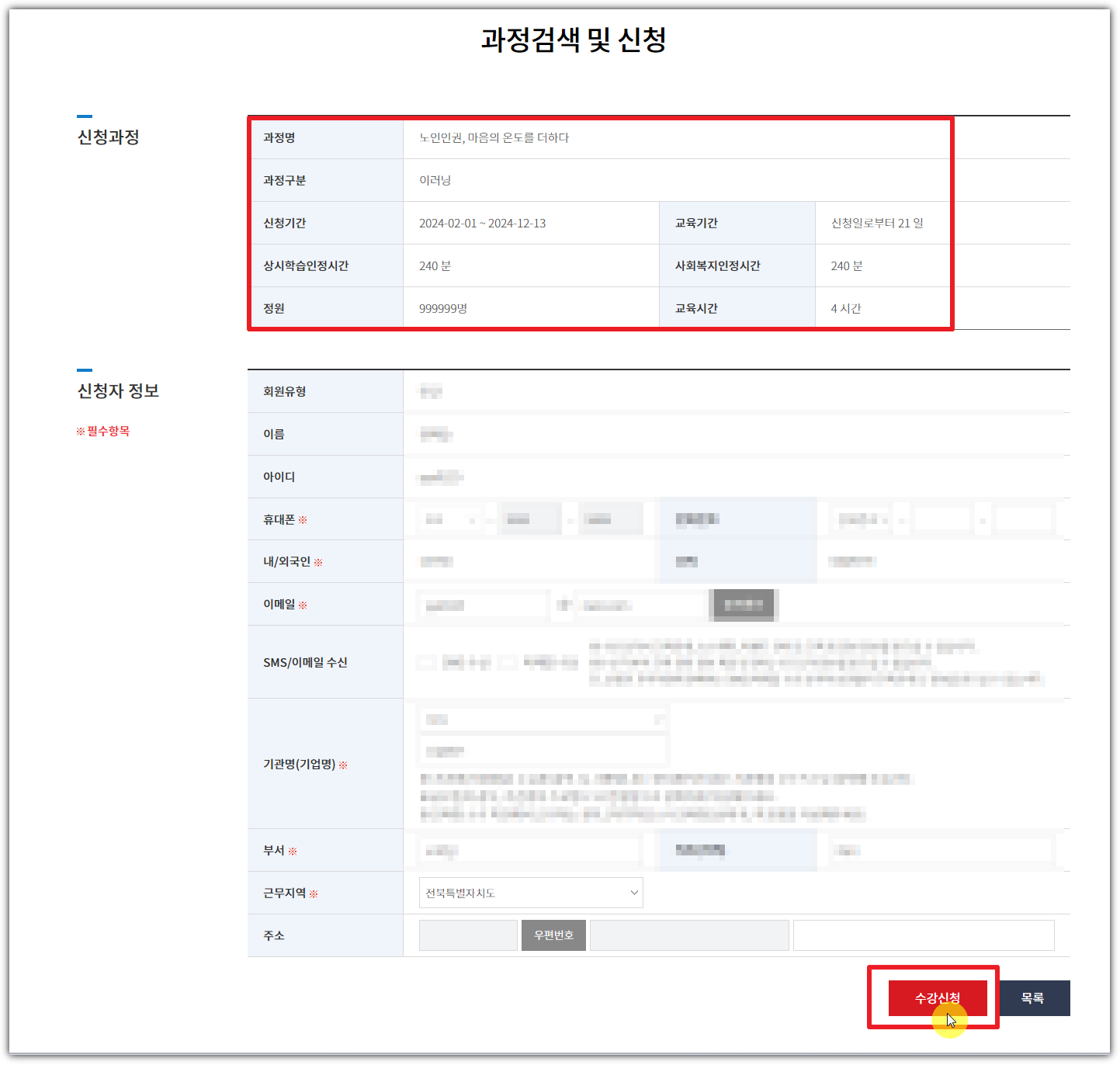 - 신청자 정보를 입력한 후 수강신청을 완료합니다.