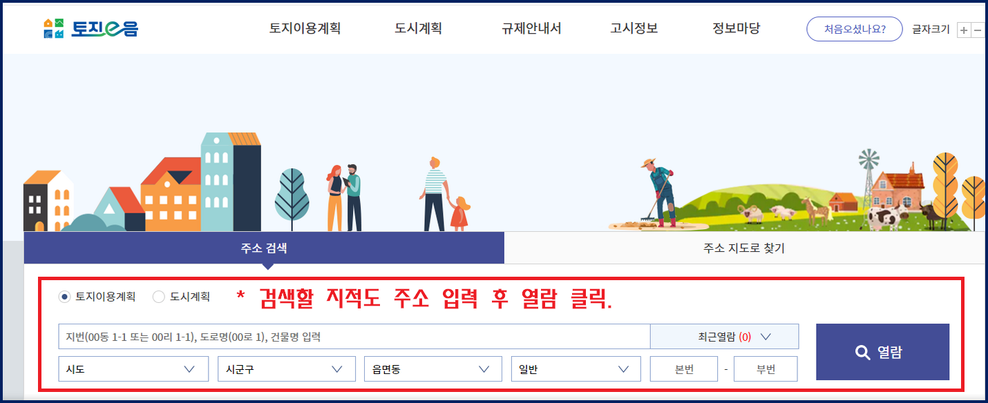 웹사이트에 접속한 후, 상단 메뉴에서 토지 이용 계획 항목을 찾아 클릭/이 섹션은 특정 지역의 토지 이용 현황 및 계획을 확인할 수 있는 곳으로, 각 지역의 개발 및 이용 계획에 대한 상세한 정보를 제공. - 정보 입력
