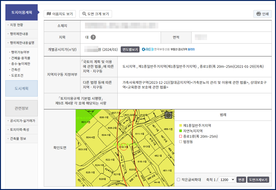 이러한 정보들은 토지에 대한 전반적인 사항들을 이해할 수 있으며 자세한 지적도 정보를 확인하고 싶으신 경우, 웹사이트 오른쪽 하단에 위치한 도면 크게 보기 버튼을 클릭하시면 됩니다. 이 기능을 통해 지적도의 도면을 다양한 축척으로 확대하여 상세히 살펴볼 수 있습니다. 또한, 해당 페이지에서는 용적률 및 도시 계획 정보와 같은 추가적인 내용도 확인할 수 있습니다. 용적률은 특정 토지의 건축 가능 면적을 나타내며, 도시 계획 정보는 해당 지역의 개발 방향과 규제를 설명하고 있습니다. 마지막으로 개별 공시지가에 대한 정보도 확인 가능합니다.