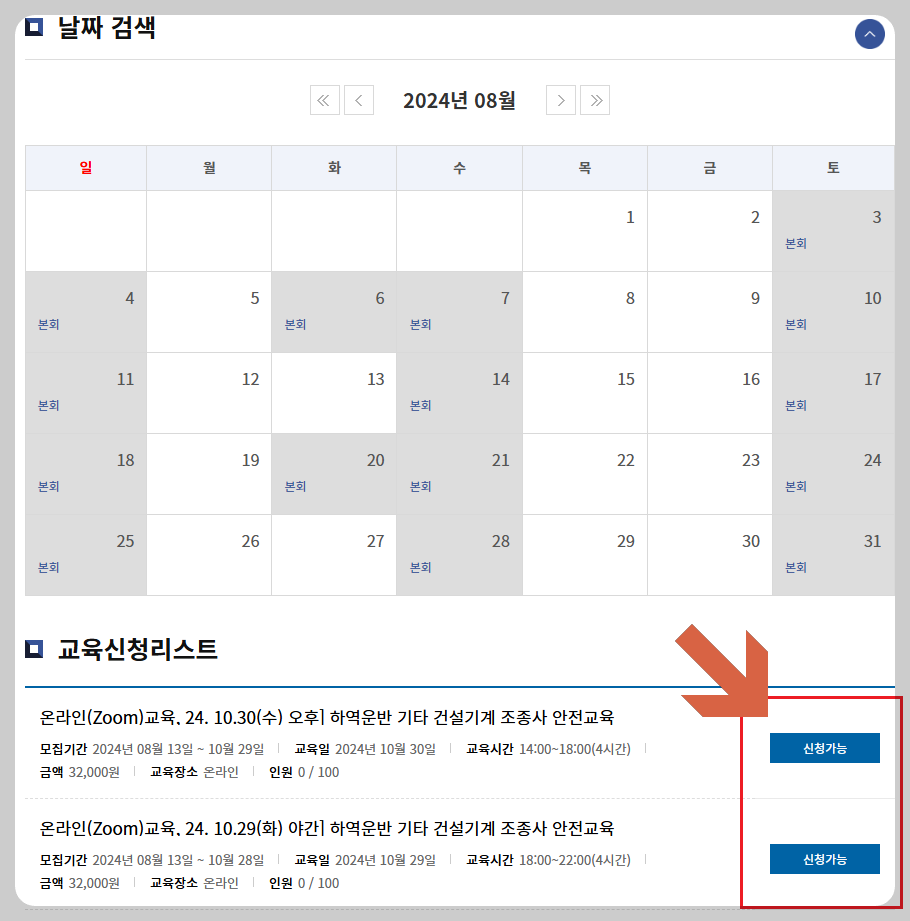 - 교육신청(온라인) 메뉴에서 수요일, 목요일, 토요일 중 원하는 교육 일자를 선택합니다.