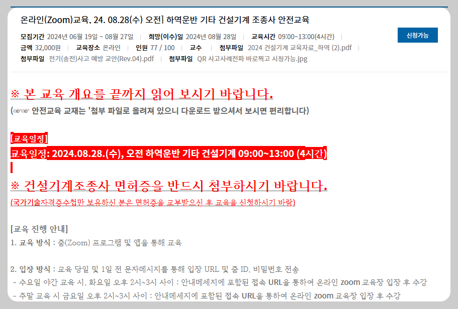 - 교육 방식: 줌(Zoom) 프로그램 및 앱을 통해 진행됩니다.