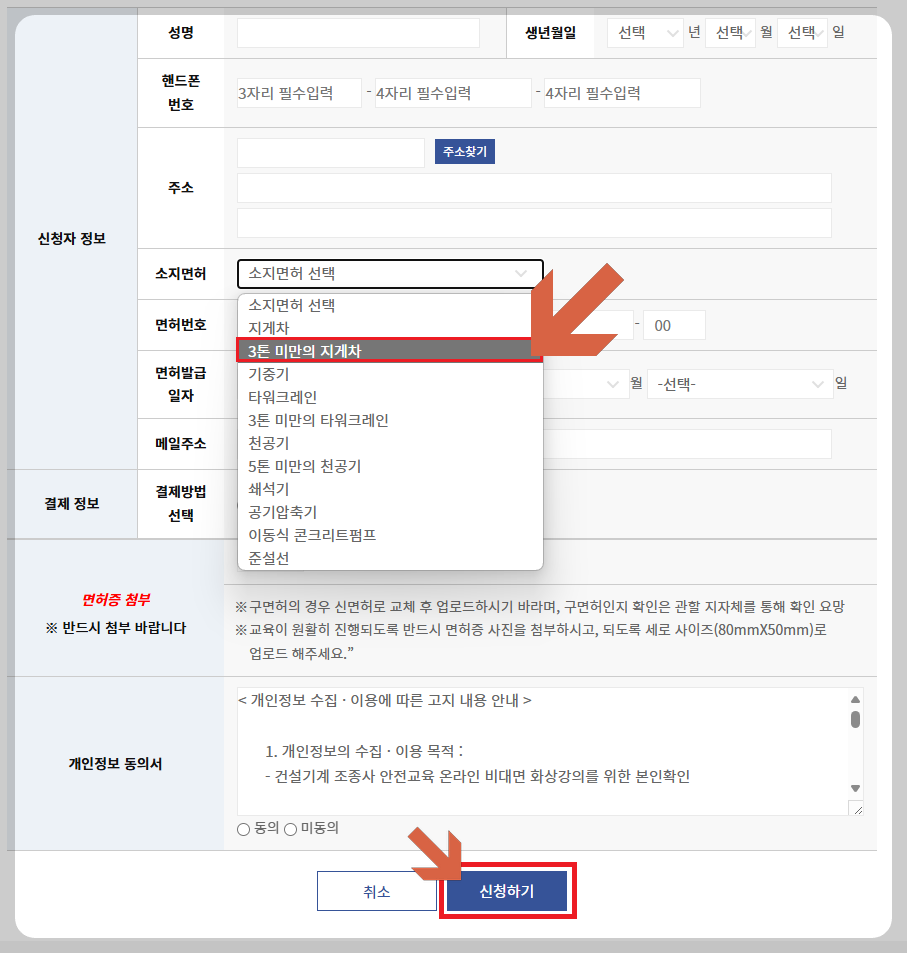 - 본인의 기본 인적 사항과 소지하고 있는 건설기계 면허증 정보를 입력합니다. - 하단에 면허증을 첨부합니다.