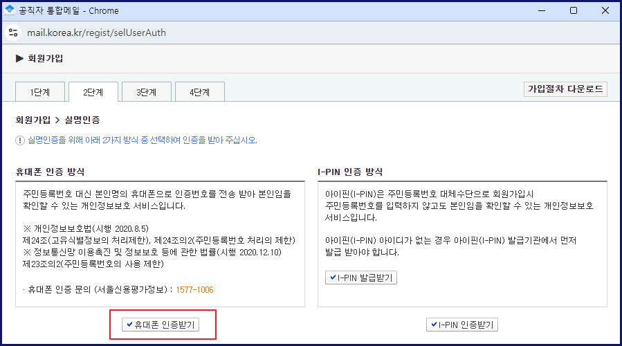 공직자 통합 메일웹사이트에 접속하여 회원가입 버튼을 클릭합니다. “이용약관 및 개인정보 처리 방침(필수, 선택)을 읽고, 필수 항목의 수집 및 이용에 동의합니다.”를 체크한 후, 이용 용도에 맞게 개인(공직자) 또는 대표 계정(기관 별) 중 하나를 선택합니다. 실명 인증은 휴대폰 인증 방식과 I-PIN 인증 방식 중에서 선택할 수 있습니다.
