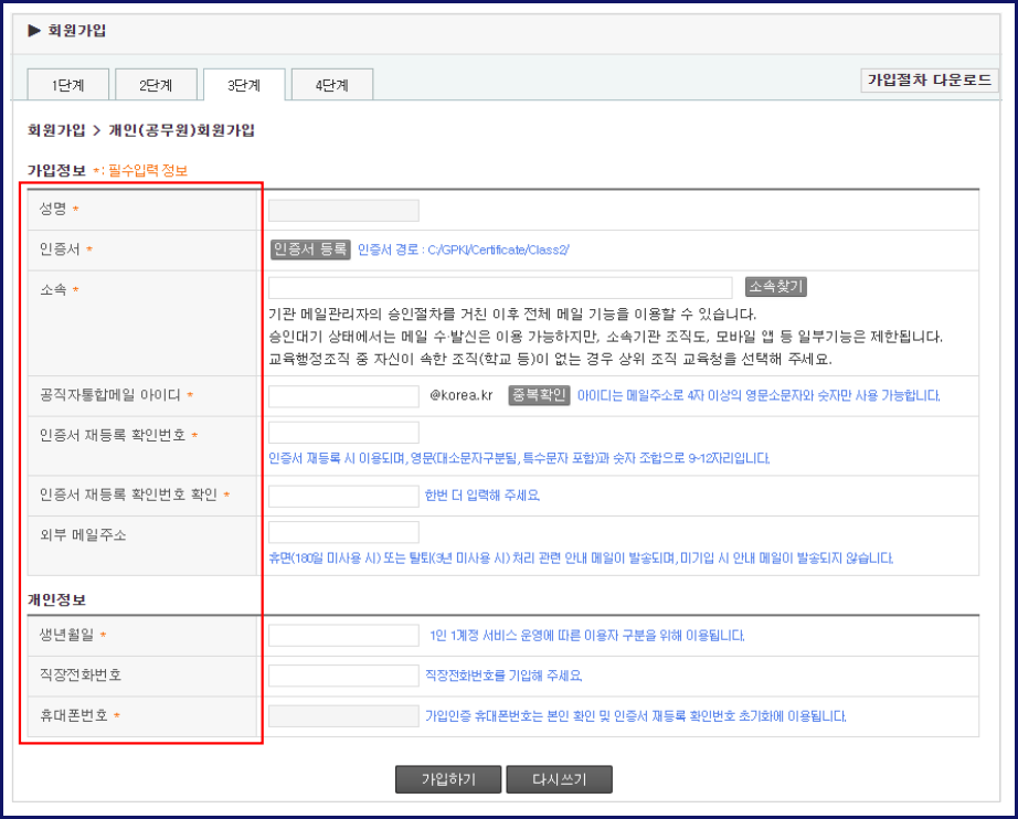 - 인증서 등록, 소속, 공직자 통합 메일 아이디, 인증서 재등록 확인 번호, 인증서 재등록 확인 번호 확인, 외부 메일 주소, 직장 전화번호 등을 입력합니다.