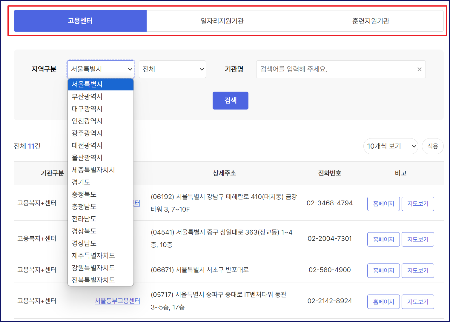 이밖에 각 지역별 고용센터 및 일자리 지원기관 그리고 훈련 지원기관의 정보가 필요할 경우 고용24 홈페이지내 기관찾기를 통해 본인 거주지 관할 또는 일자리를 구하고싶은 지역의 고용센터에 대한 상세주소 및 유선번호를 확인할 수 있습니다. 또한 기관명 클릭 시 업무별 연락처를 제공, 빠른 일처리가 가능하니 참고하시기 바랍니다.