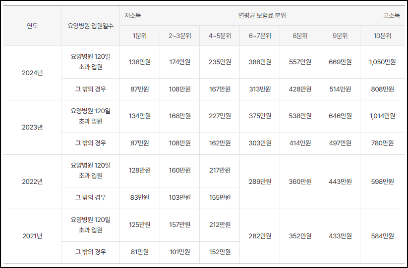 위 이미지표는 2021년부터 2024년까지 요양병원 입원일수에 따른 저소득 및 연평균 보험료 분포를 나타내는것으로 각 연도별로 '요양병원 120일 초과 입원'과 '그 밖의 경우'로 나누어 보험료가 구체적으로 정리되어 있습니다. 또한 저소득과 고소득 구간별로 차등화된 보험료를 확인할 수 있으니 참고하시기 바랍니다.