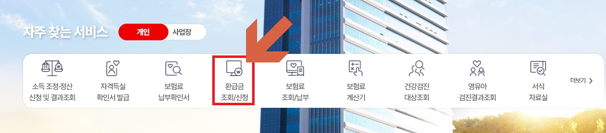 - 건강보험공단 홈페이지 또는 어플을 접속하여 환급금 조회/신청을 클릭
