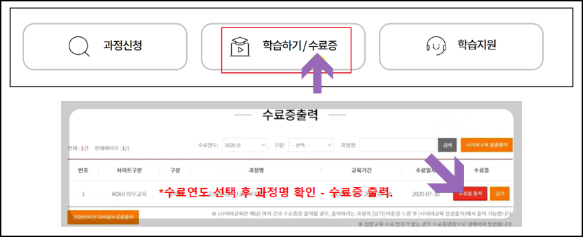 - 수료증 출력 선택 : 수료한 교육 과정에서 '수료증 출력' 버튼을 클릭합니다.
