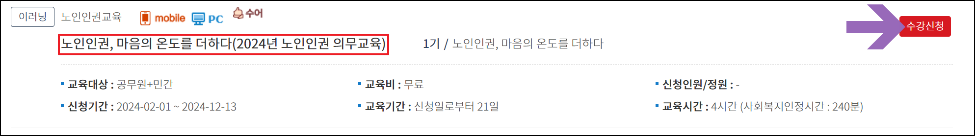 아래 예시는 2024년 노인인권 의무교육 신청 과정으로 타 과정 또한 동일한 절차대로 운영되니 참고하시기 바랍니다.