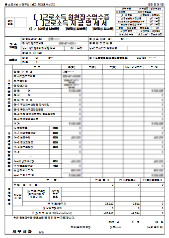 원천징수영수증은 근로자가 소득을 얻는 과정에서 발생한 세금을 고용주가 대신 납부한 사실을 증명하는 문서입니다. 이는 소득세 신고와 연말정산, 각종 금융 관련 업무에 필수적으로 사용됩니다.