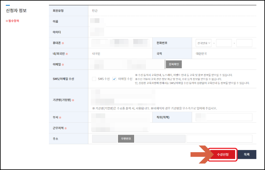 - 신청 과정 및 신청자 정보 입력 후 수강신청을 클릭합니다.