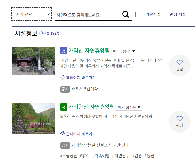 - 휴양림 선택 : 지역별, 테마별 검색으로 원하는 휴양림을 선택합니다. 다양한 옵션을 통해 쉽게 찾을 수 있습니다.