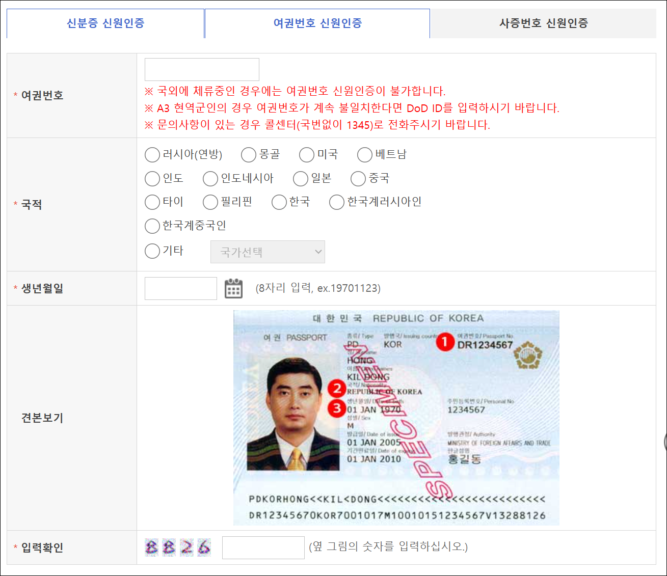 - 외국인 등록번호 또는 국내인 인증