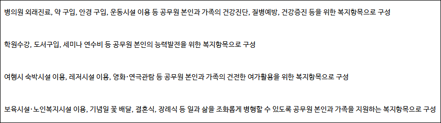 | 여가활동 | 여행, 숙박, 레저시설, 영화·연극 관람 등 여가생활 지원 |