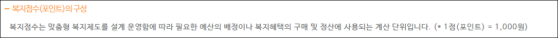 | 건강관리 | 병원 진료, 약 구입, 건강검진, 운동시설 이용 등 건강 관련 지원 |