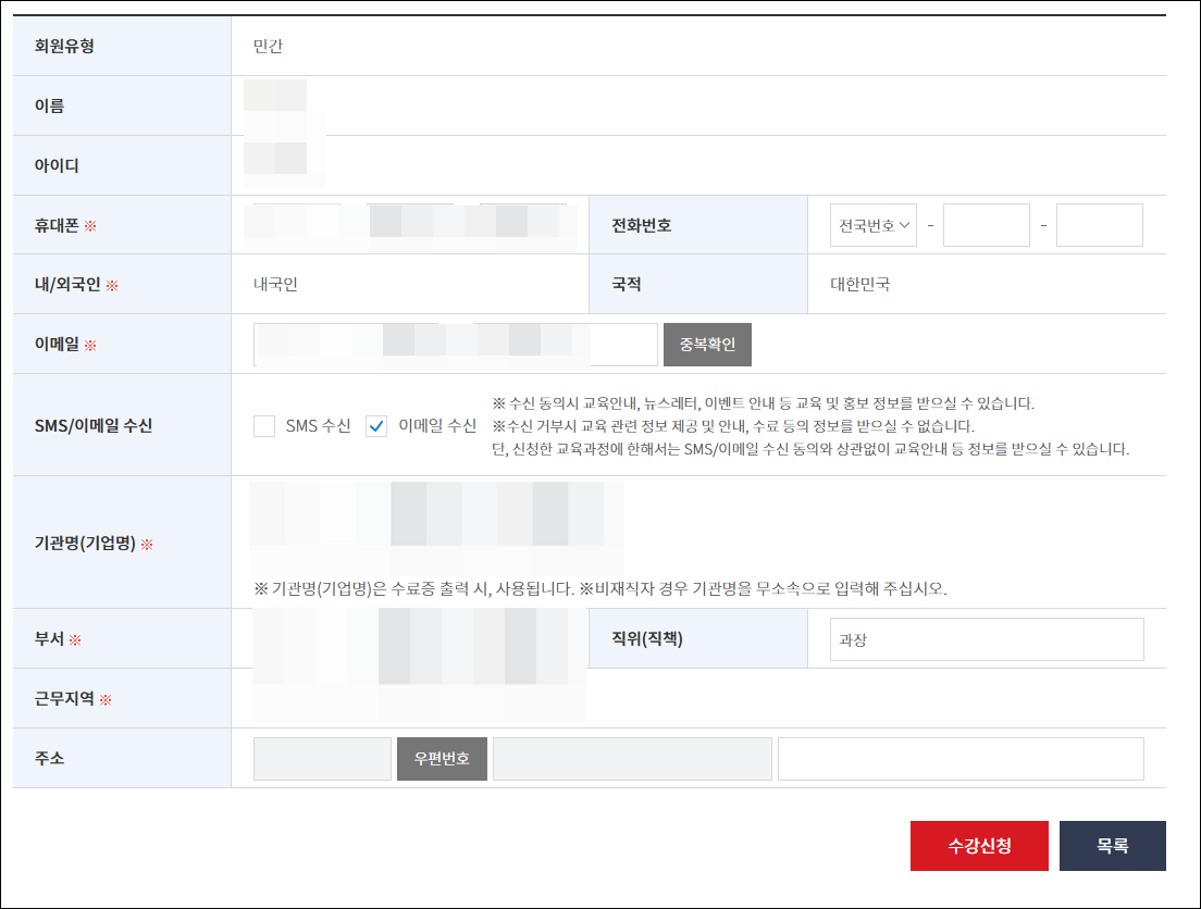 - 신청자의 기본 정보를 확인하고 입력합니다.