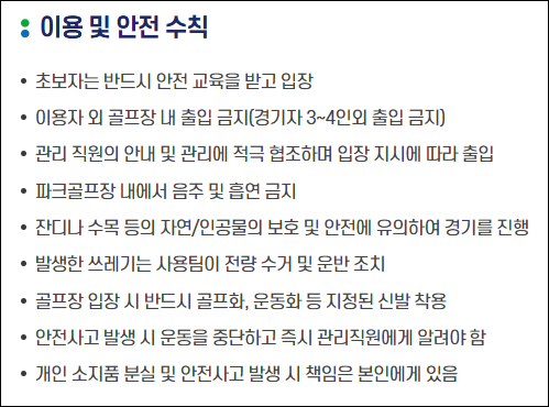 사천모충파크골프장은 쾌적하고 안전한 이용을 위해 반드시 지켜야 할 규칙과 수칙을 운영 중입니다. 이용자 간의 배려와 코스 보존을 위한 약속이므로, 방문 전 반드시 숙지하시기 바랍니다.