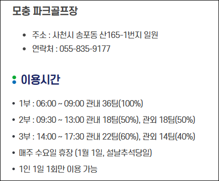 사천모충파크골프장은 쾌적한 코스 관리와 안전한 시설 운영을 위해 정기 휴장일과 임시 휴장일을 지정하여 운영 중입니다. 또한 계절과 상황에 따라 운영 시간이 변동될 수 있으니 방문 전 반드시 공식 운영 일정을 확인하시는 것이 중요합니다.