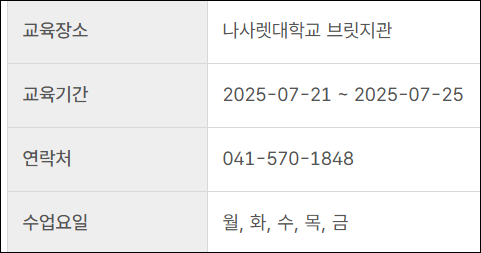 - 교육기간은 일반적으로 4~5일 이내로 구성되며, 주중 혹은 주말반으로 나누어 진행되기도 합니다.