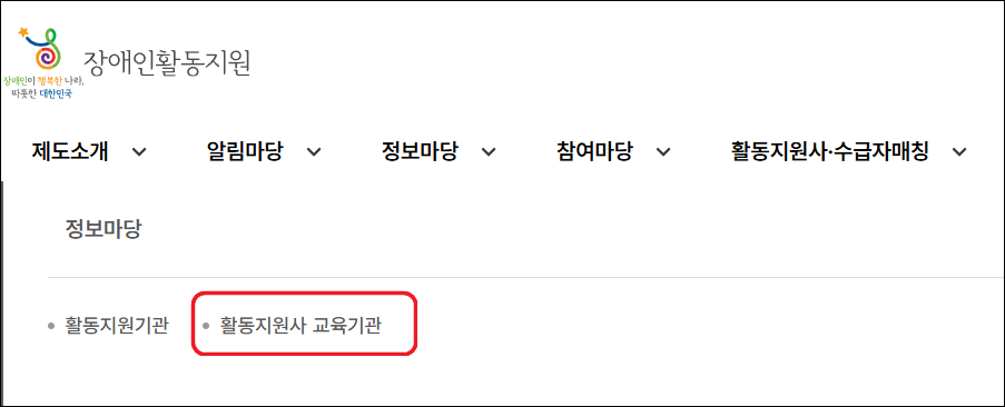 - 상단 메뉴 ▶ ‘활동지원사 교육기관 검색’