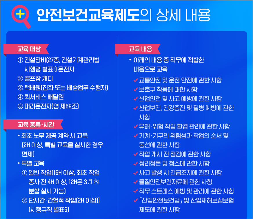 - 교육 주체: 고용노동부, 안전보건공단, 지정 교육기관
