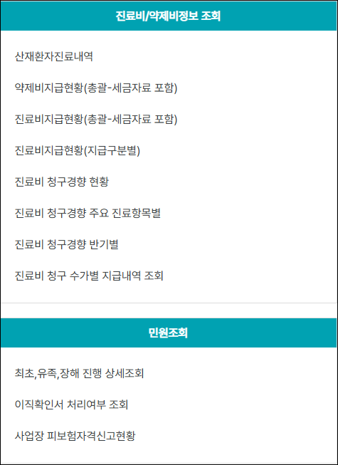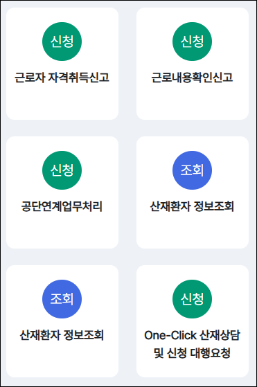 | 산재·고용보험 개인민원 | 산재보험 요양신청·승인조회, 보험급여 지급내역 확인, 휴업급여·간병급여 신청 |