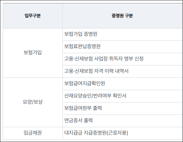 | 업무 범위 | 고용보험 및 산재보험 신고, 보험료 조회, 증명서 발급, 사업장·근로자 정보 조회, 일자리지원금/휴업급여 등 다양한 민원 서비스 |