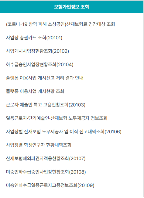 | 고용·산재보험 가입내역 조회 | 본인 고용·산재보험 자격취득 및 상실 내역 조회 |