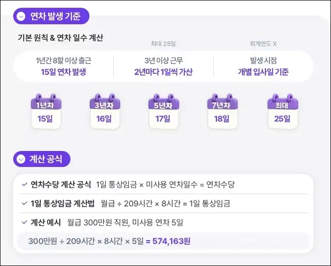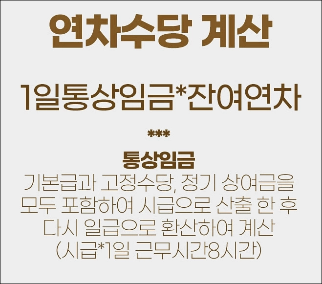 - 연차수당 계산 공식: 연차수당 = 미사용 연차 일수 × 1일 통상임금 또는 평균임금