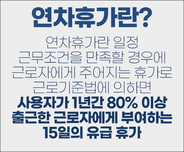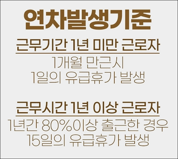 | 1년 이상 근속자 | 입사 1년 완료 | 연간 출근률 80% 이상 | 다음 해 15일 연차 발생 | 월별 계산과 중복 차감 없음 |