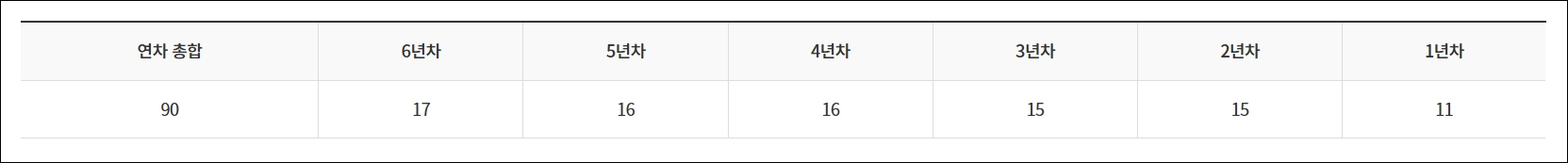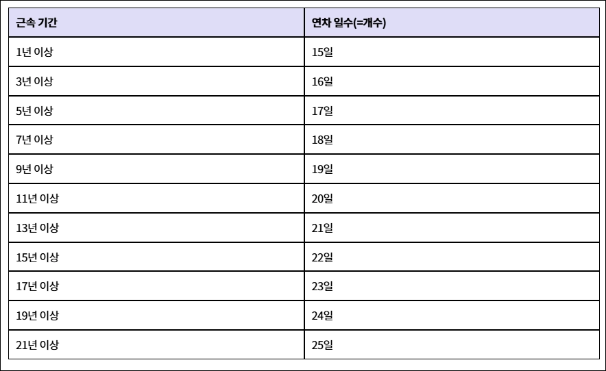 | 3년 이상 근속자 | 1년 초과 후, 3년 이상 | 연간 출근률 80% 이상 | 2년마다 1일 가산 | 총 연차 최대 25일 |