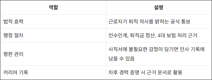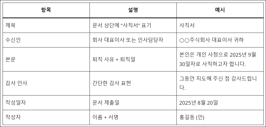 | 사직 의사 표시 | 퇴직하겠다는 명시적 문장 | "사직하고자 합니다" 등 단호한 의사 표현 필요 | 필수 |