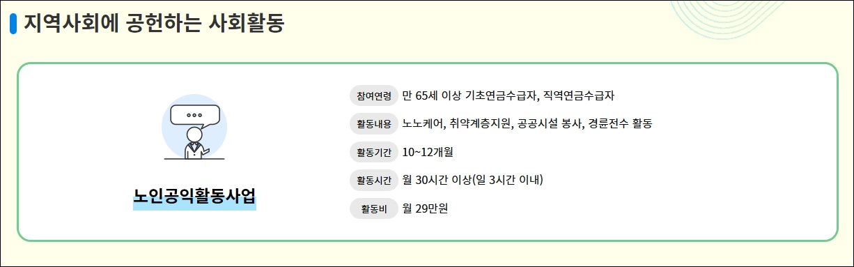 | 공익활동형 | 노인공익활동사업 | 공공시설 봉사, 경로당 지원, 취약계층 돌봄(노노케어 포함) | 월 30시간 | 월 29만 원 정액 지급 |