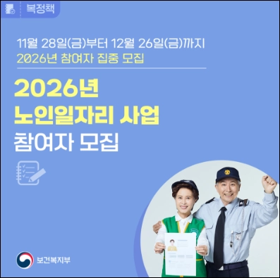 - 2026년 노인일자리 및 사회활동 지원사업의 참여자 모집 기간은 2025년 11월 28일(금) ~ 12월 26일(금) 입니다.