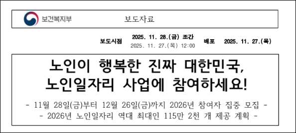 대한민국이 고령사회로 빠르게 진입함에 따라, 노년기의 삶의 질과 경제적 안정은 매우 중요한 사회적 과제가 되었습니다. 이에 대응하여 보건복지부를 중심으로 운영되는 노인일자리 여기는 일자리를 원하는 어르신들에게 소득 보충, 사회 참여,건강한 노후생활을 지원하는 중요한 통로입니다. 2026년 모집부터는 역대 최대 규모인 115만 2천개의 일자리가 제공될 예정이며, 신청 자격 및 절차도 매년 갱신되고 있습니다. 이 글에서는 2026년 노인일자리 여기 신청자격 및 방법, 주의사항등을 체계적으로 정리합니다.