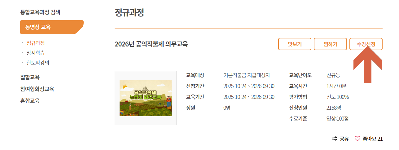 - 로그인 후 교육과정 목록에서 「공익직불제 의무교육」 과정을 선택합니다.