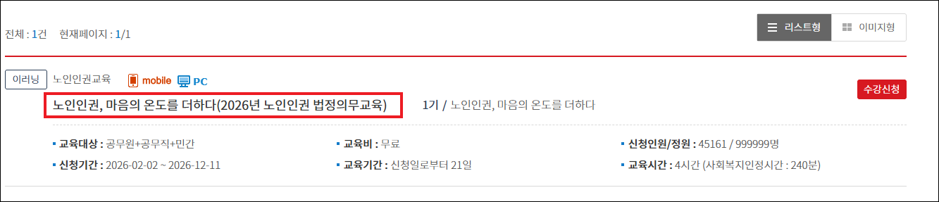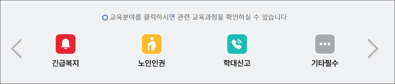 - 검색 필터를 활용하여 본인의 소속 기관 유형(공공기관, 시설, 의료기관 등)과 직무를 설정하면 이수가 필요한 필수 과목을 선별할 수 있습니다.