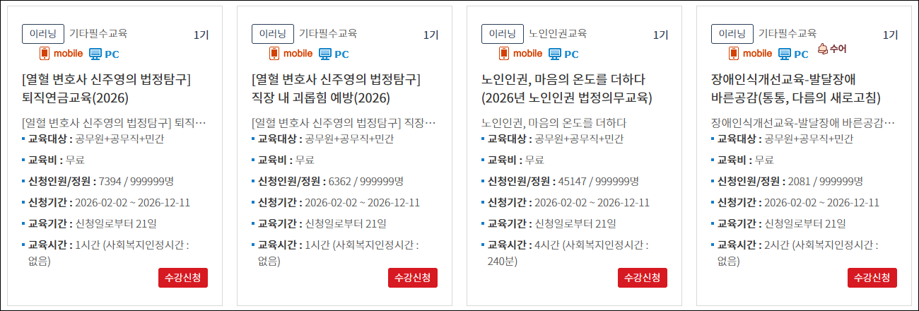 - 일부 과정은 승인 절차가 필요할 수 있으나, 대부분의 온라인 의무교육은 신청 즉시 '나의 강의실'에서 학습을 시작할 수 있습니다.