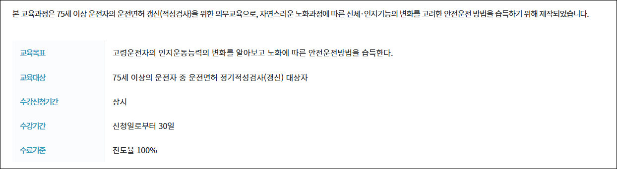 - “나의 강의실” 또는 “수강중인 과정” 메뉴에 고령운전자 교육이 추가되며, 신청일 기준 30일 이내에 수강을 완료.