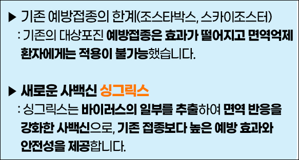 국내에는 생백신(약독화 생백신 1회 접종)과 재조합(사)백신(2회 접종)이 허가되어 있으며, 50세 이상, 특히 60~70대 이상에서 접종이 권장되고 있습니다.