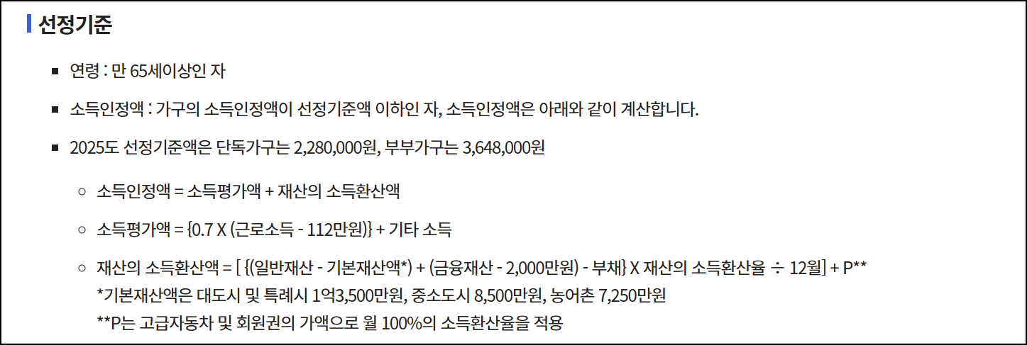 | 선정 기준 | 소득인정액이 선정기준액 이하인 자 |